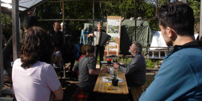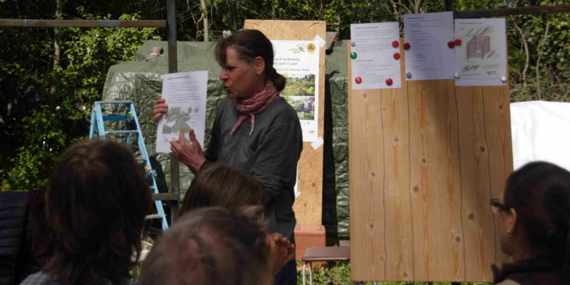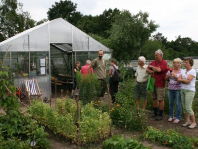 Nach einer Begrüßungsrunde zu selbstgebackenem Kuchen gab es einen ersten Vortrag von Freya Hörnig: Die Gesundheit beginnt am Tor zum Garten. Die gelernte Gärtnerin und zertifizierte Gesundheitsberaterin erklärte, wie – weil so ein Gemüsegarten alle Sinne anspricht –, er zu einer stabilen Gesundheit erheblich beitragen kann. Anschließend gab es eine Führung durch den Garten: die beiden Mit-Gärtner Matthias und Susanne stießen mit ihrem profunden Wissen über Wildkräuter auf ein großes Interesse im Publikum.