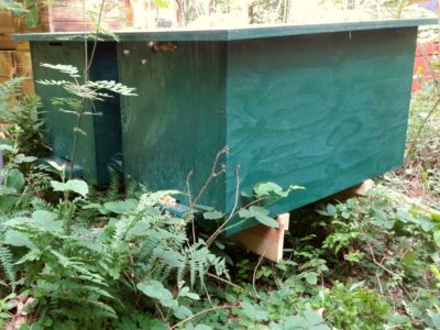 Sodann begann das große Messen, Sägen, Bohren und Festschrauben. Und tatsächlich konnten am Ende des Nachmittags eine fertige Beute – so nennt sich in der Fachsprache der Bienenkasten – aus Fichtenholz abgeflammt und zum nahegelegenen Ort ihrer Bestimmung gebracht werden. Robert setzte eines seiner Bienenvölker um und nach einer Viertelstunde bereits flogen die ersten Bienen aus den beiden Fluglöchern ein und aus.
